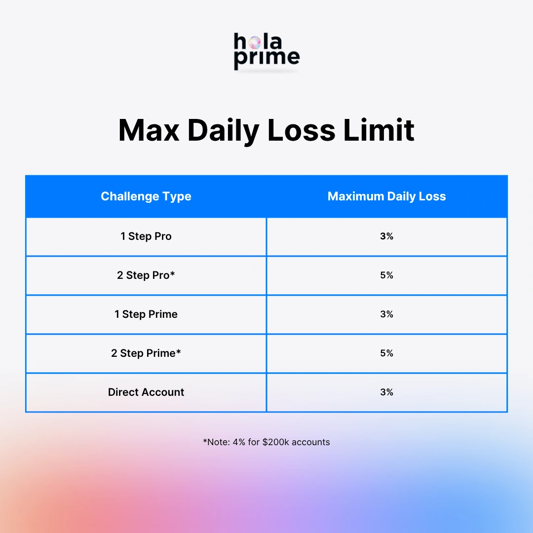 The daily loss limit in 1-step pro and prime Hola Prime accounts and Direct Model is 3% of the previous day’s closing balance, and in 2-step pro and prime Hola Prime accounts, it is 5% (4% for $200k accounts) of the previous day’s closing balance.