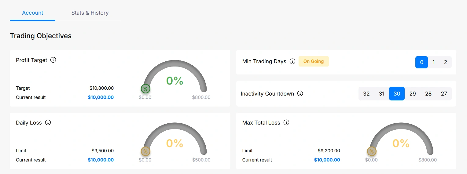 - A simple interface for an overview of your trading objectives which include profit target, daily loss, max loss limits, etc..