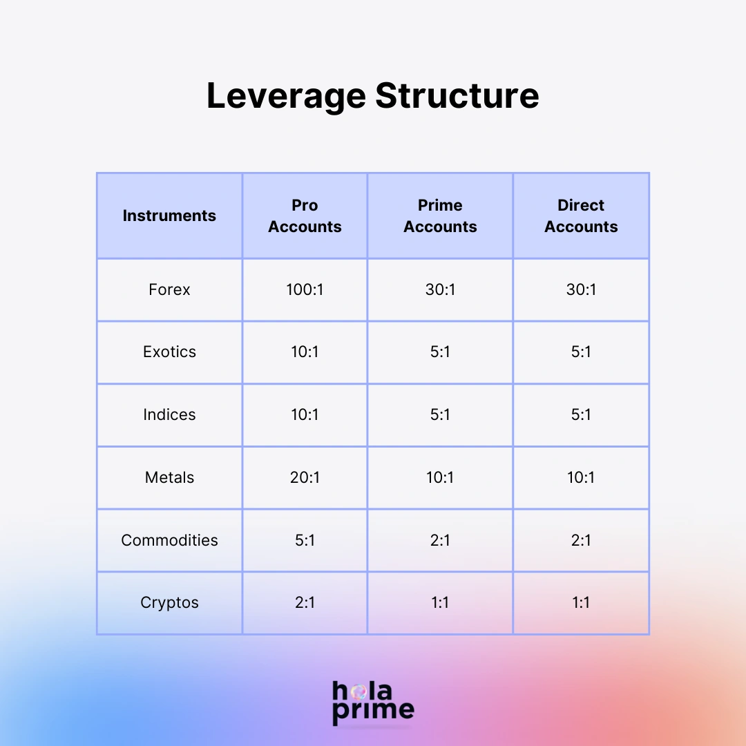 Pro Accounts (challenge and Hola Prime a/cs): Offer leverage of up to 100:1.
