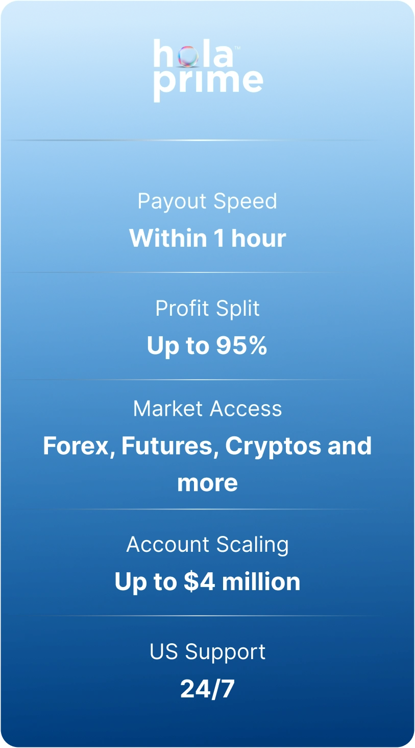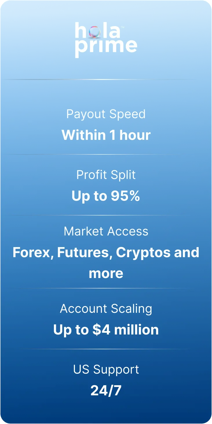 Trade with the best prop firm for US traders that provides payouts in 1 hour, offers everything from forex to futures, and has over 6 top trading platforms, including TradeLocker, DX Trade and MatchTrader available for you. With its trader-friendly rules and transparency, Hola Prime has become the number one prop firm in the USA.